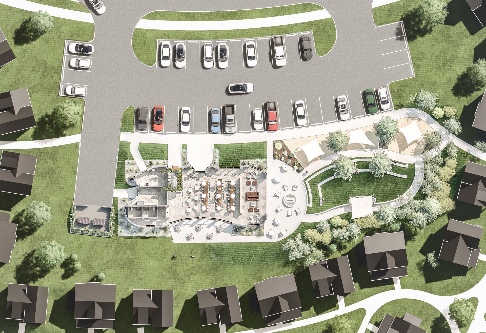 Framed by the welcoming front porches of surrounding cottages, the courtyard is anchored by the Capella Cottages Café—a charming café pavilion that serves as both a culinary destination and a social connector. With outdoor seating shaded by native trees, the café spills into the courtyard, inviting residents and visitors alike to linger over fresh, farm-to-table meals crafted from ingredients grown steps away in the adjacent community garden.