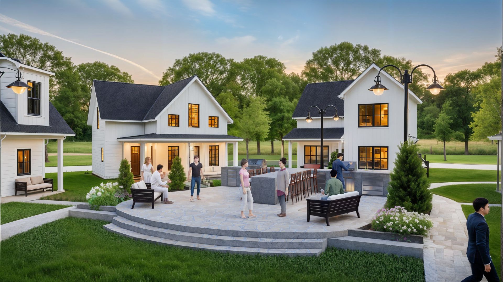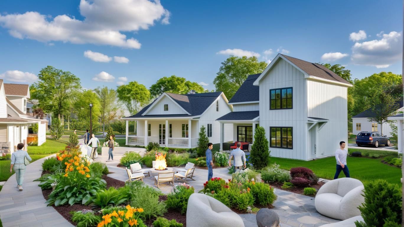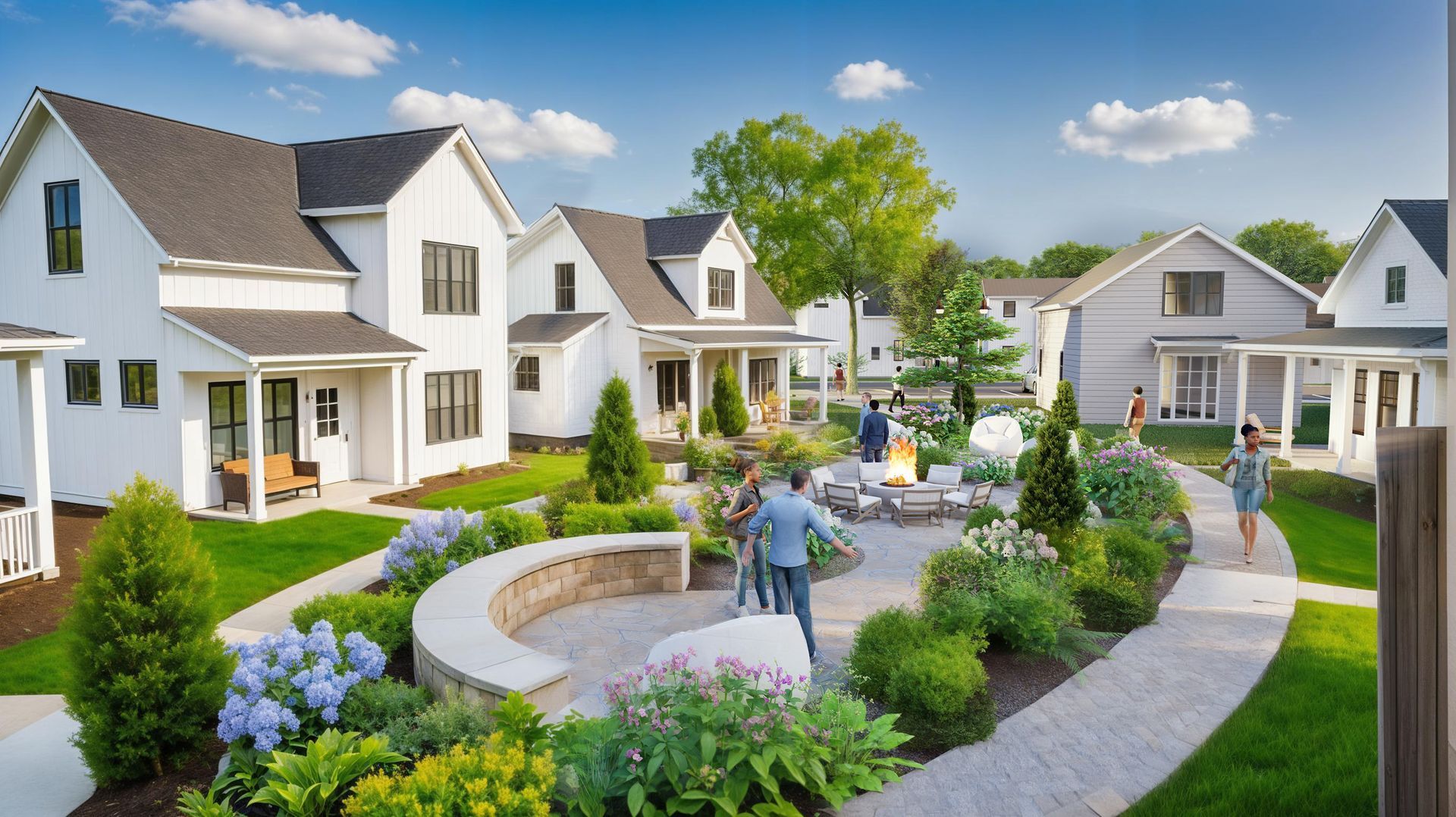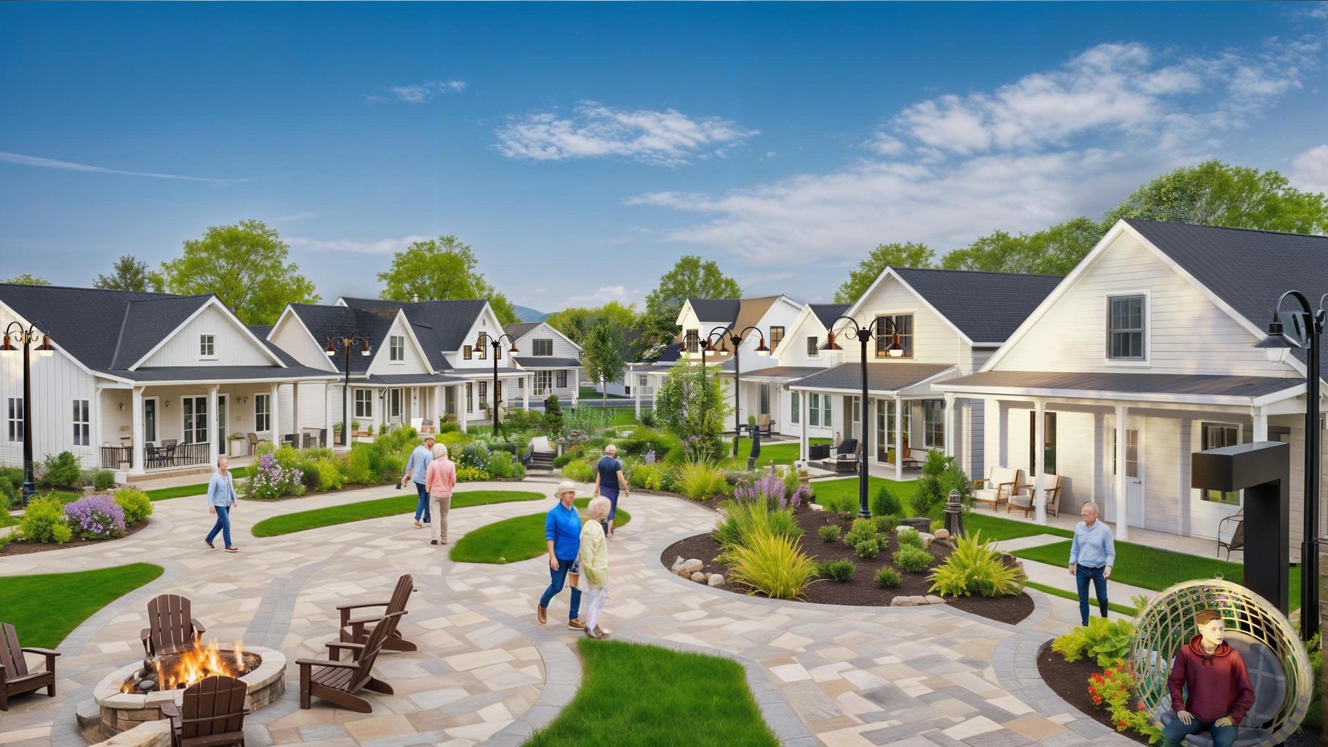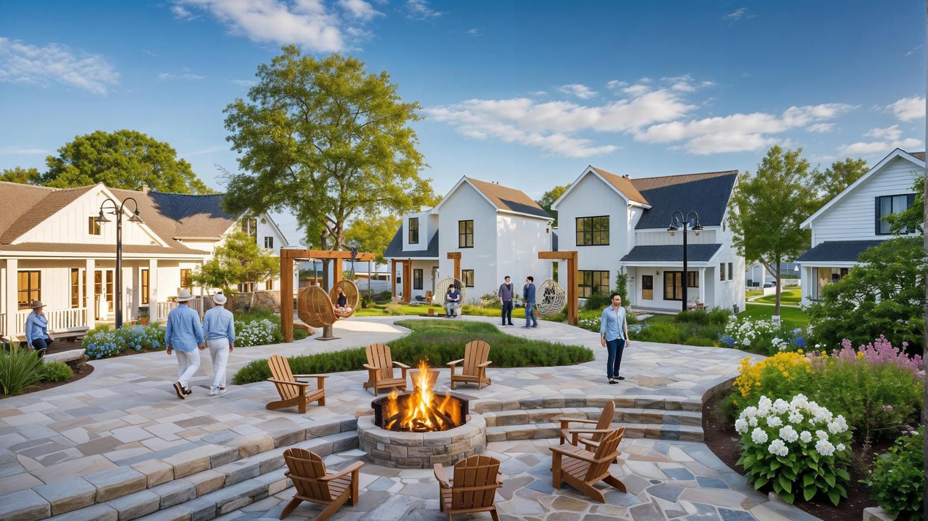 Anchoring the courtyard is a modern circular fire pit surrounded by built-in stone seating and Adirondack-style chairs. It’s a place for literal and social warmth, where neighbors can gather in the evenings to share stories or enjoy the quiet crackle of the flames under the stars. - 🌿