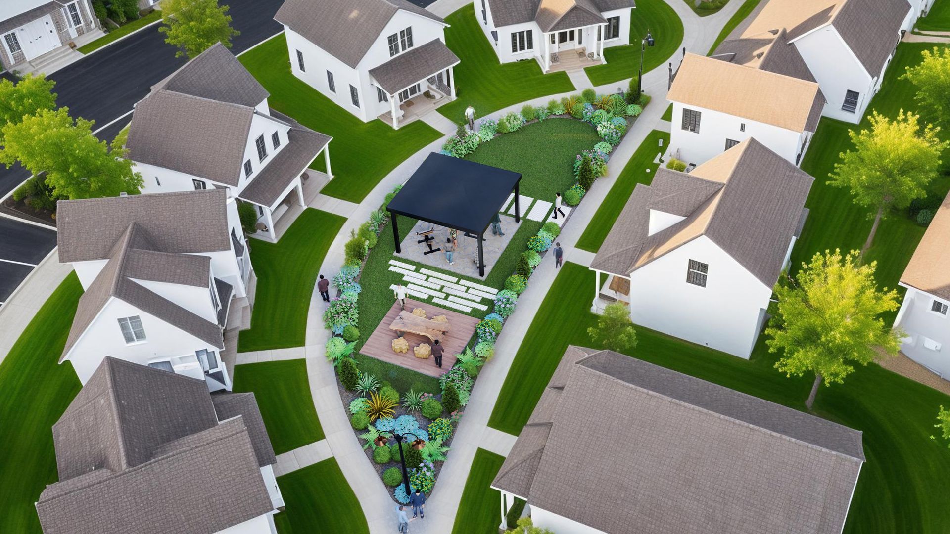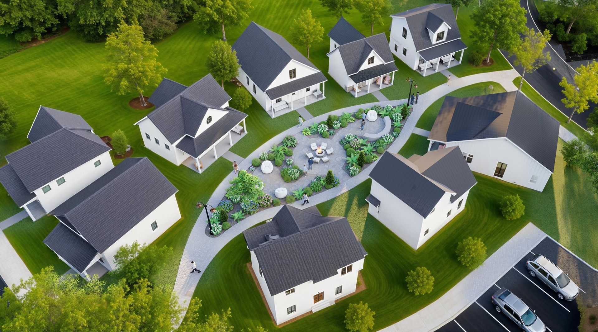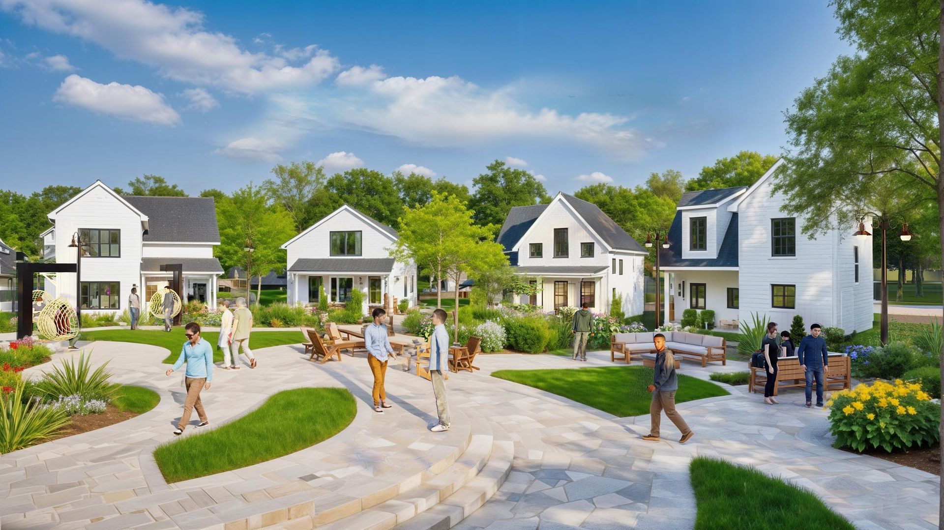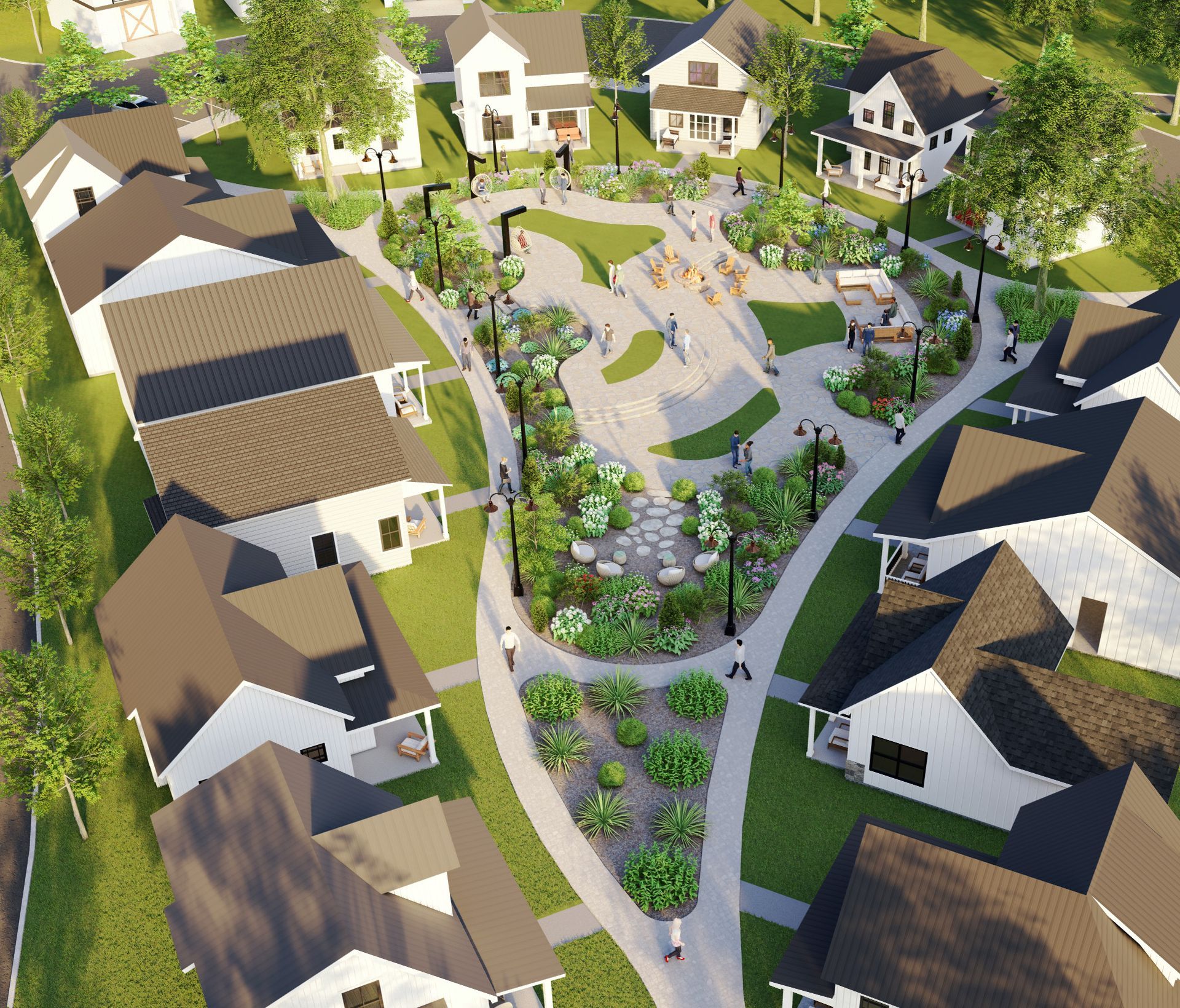 Around the outer edges, layered greenery and flowering shrubs serve as a natural screen and sensory buffer, gently separating the Zen Garden from surrounding homes and walkways. Residents are immersed in nature, yet steps away from their front doors.